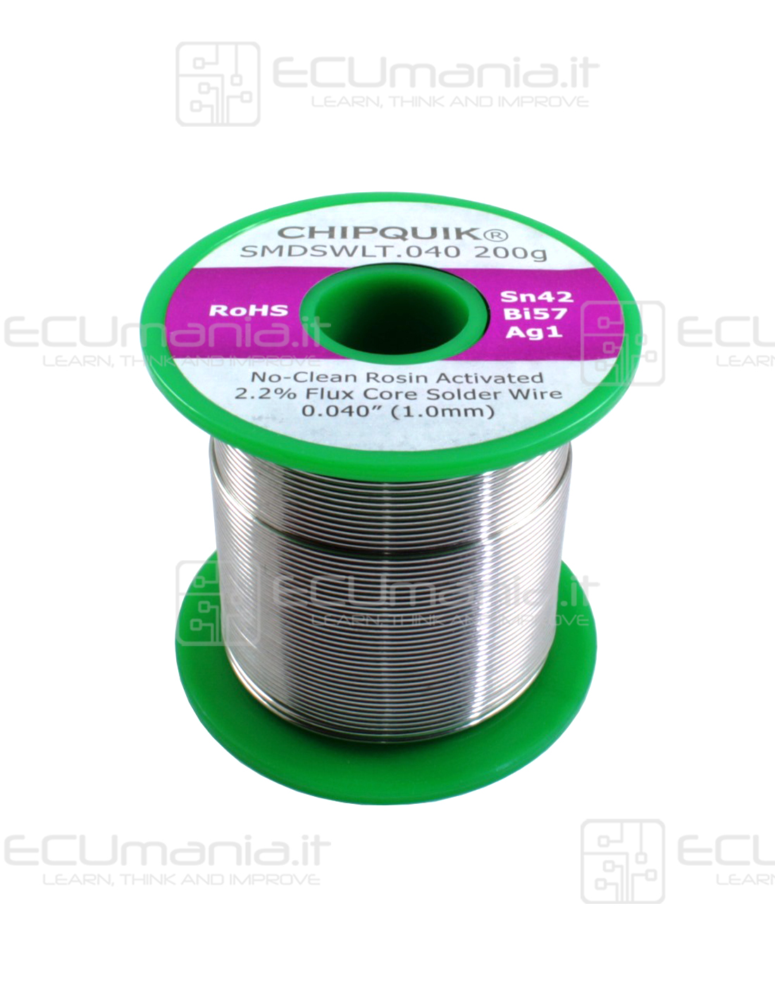 Lega di Stagno/Argento/Rame Sn42/Bi57/Ag1, LEAD FREE, diametro del filo 1.00mm, punto di fusione 138°C, flussante Rosin-Activated 2.2% No-Clean, peso 200g