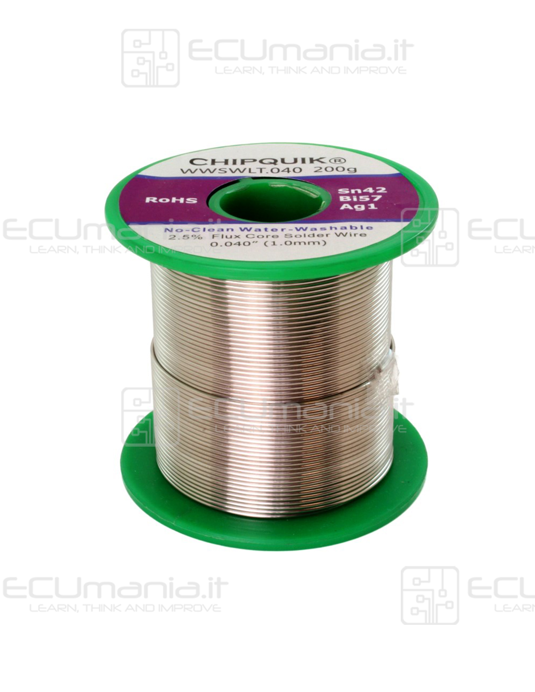 Lega di Stagno/Argento/Rame Sn42/Bi57/Ag1, LEAD FREE, diametro del filo 1.00mm, punto di fusione 138°C, flussante Water-Washable 2.5% No-Clean, peso 200g