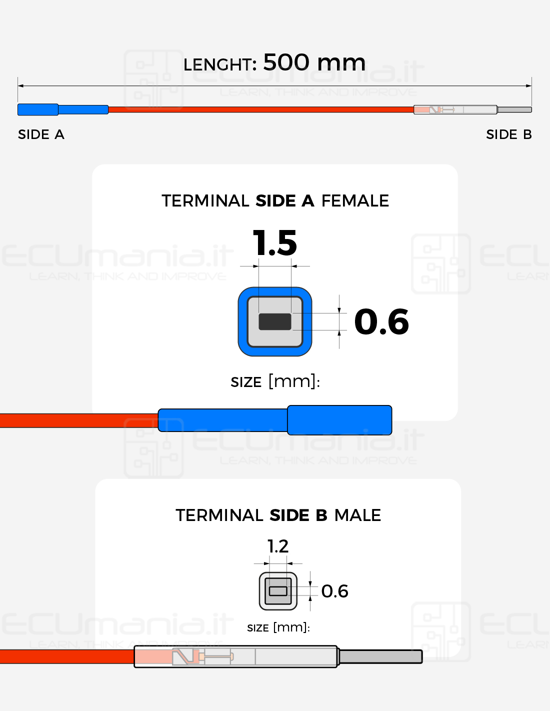 500 mm interconnection cable with MCP 1.5 × 0.6 mm female terminal and MCON 1.2 × 0.6 mm male terminal.