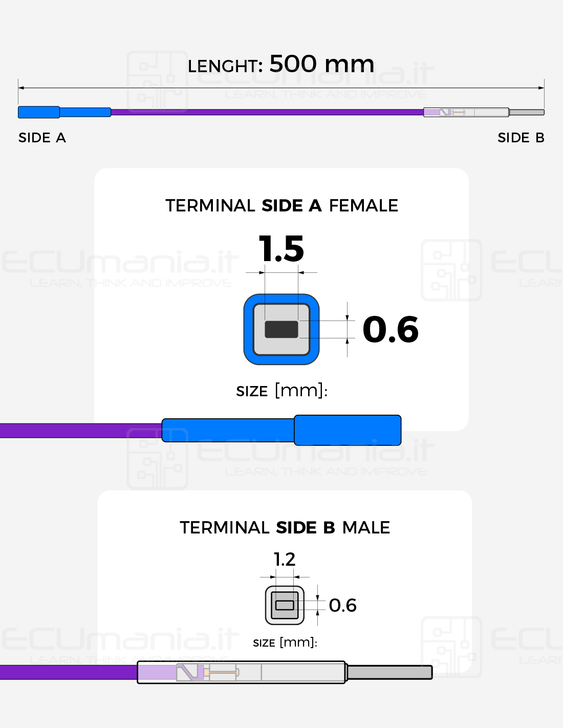 500 mm interconnection cable with MCP 1.5 × 0.6 mm female terminal and MCON 1.2 × 0.6 mm male terminal.