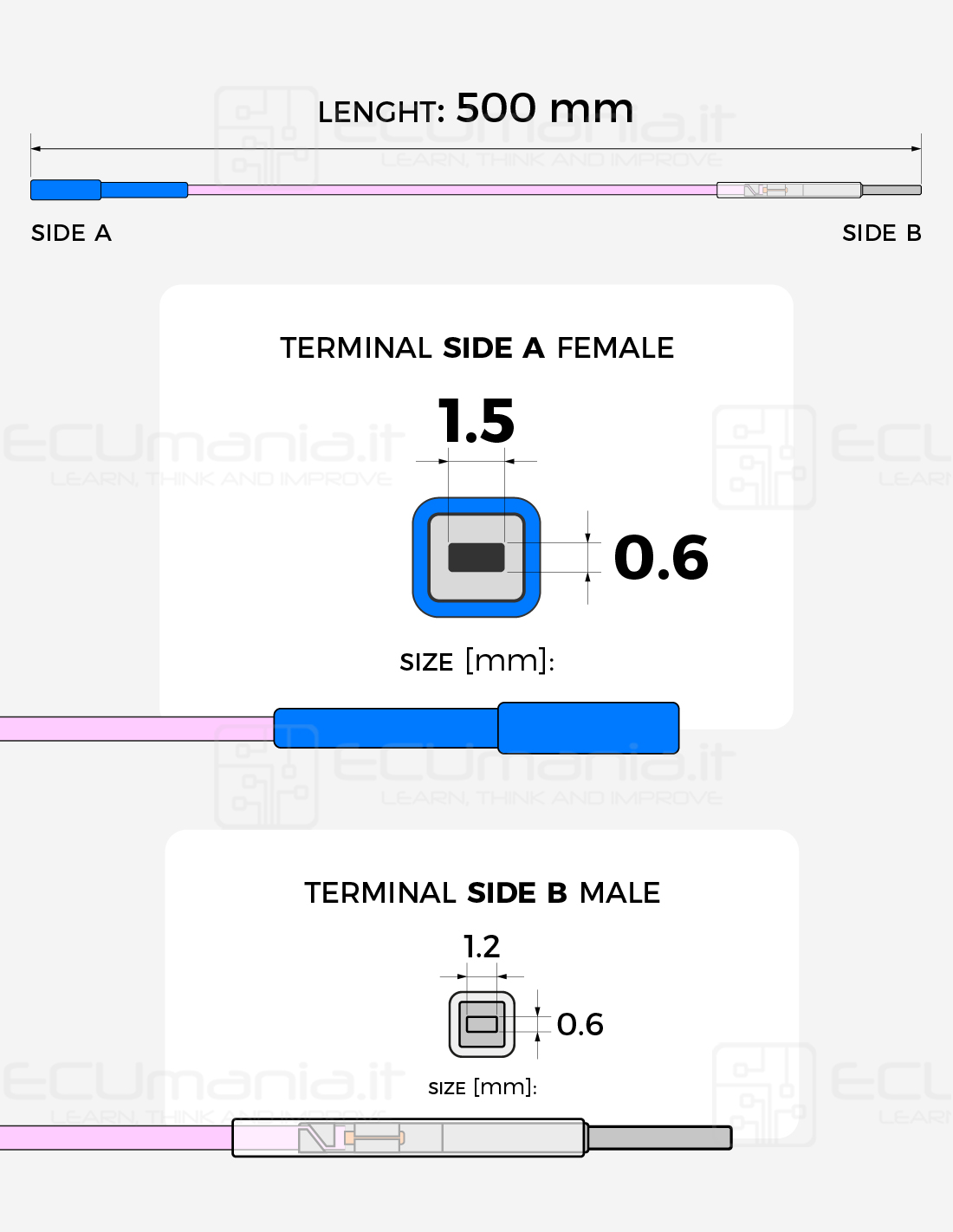 500 mm interconnection cable with MCP 1.5 × 0.6 mm female terminal and MCON 1.2 × 0.6 mm male terminal.