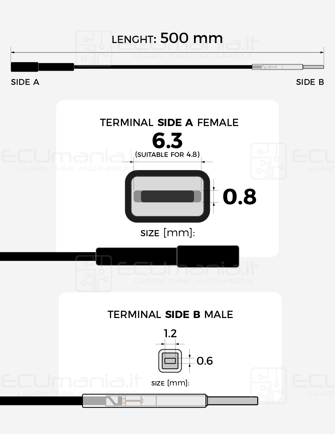 500 mm interconnection cable with MCP 6.3 / 4.8 × 0.8 mm female terminal and MCON 1.2 × 0.6 mm male terminal.