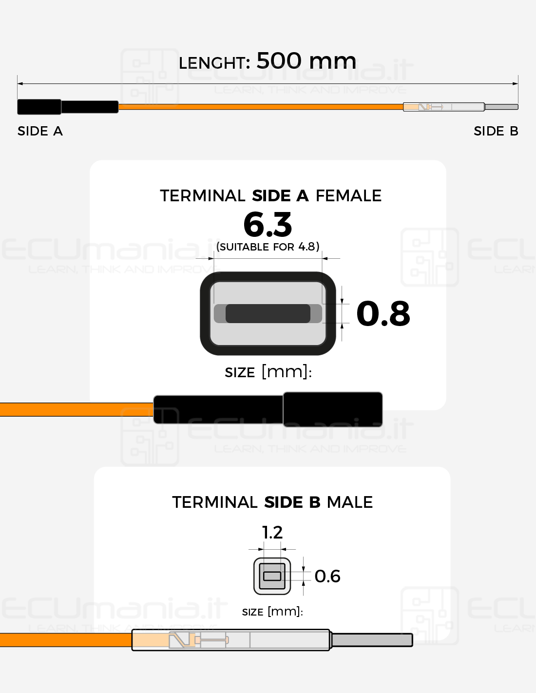 500 mm interconnection cable with MCP 6.3 / 4.8 × 0.8 mm female terminal and MCON 1.2 × 0.6 mm male terminal.