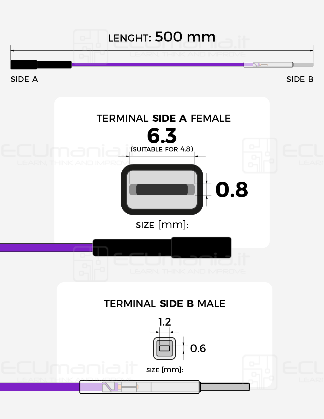 500 mm interconnection cable with MCP 6.3 / 4.8 × 0.8 mm female terminal and MCON 1.2 × 0.6 mm male terminal.