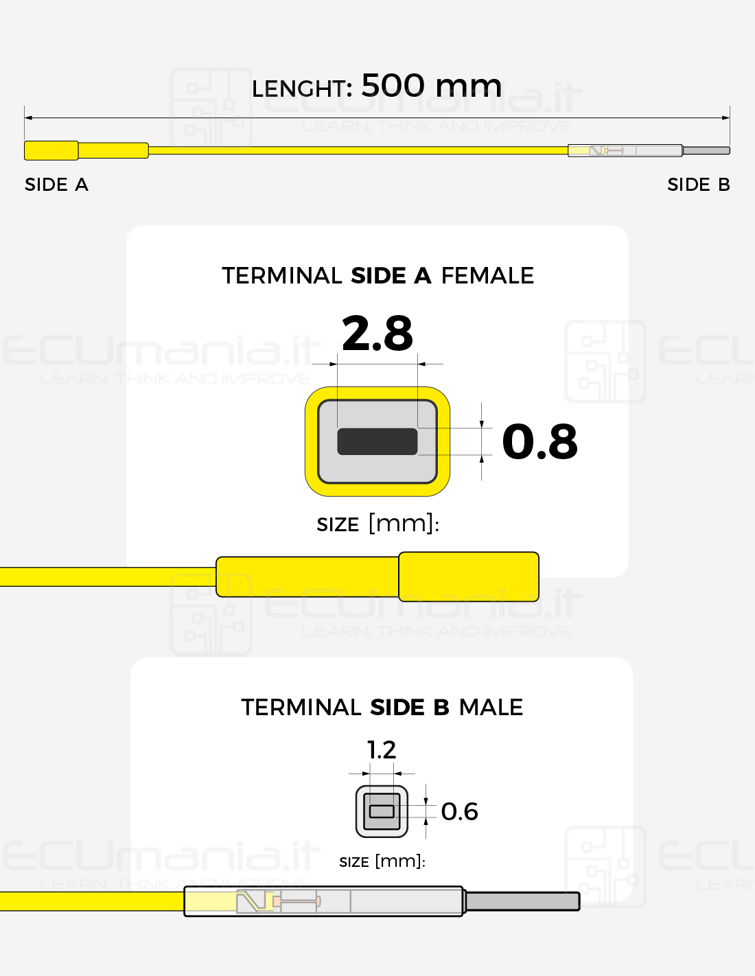 500 mm interconnection cable with MCP 2.8 × 0.8 mm female terminal and MCON 1.2 × 0.6 mm male terminal.