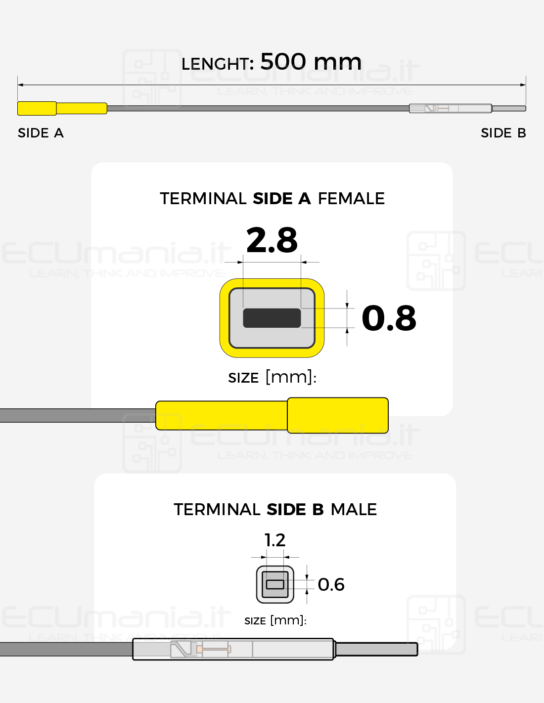 500 mm interconnection cable with MCP 2.8 × 0.8 mm female terminal and MCON 1.2 × 0.6 mm male terminal.
