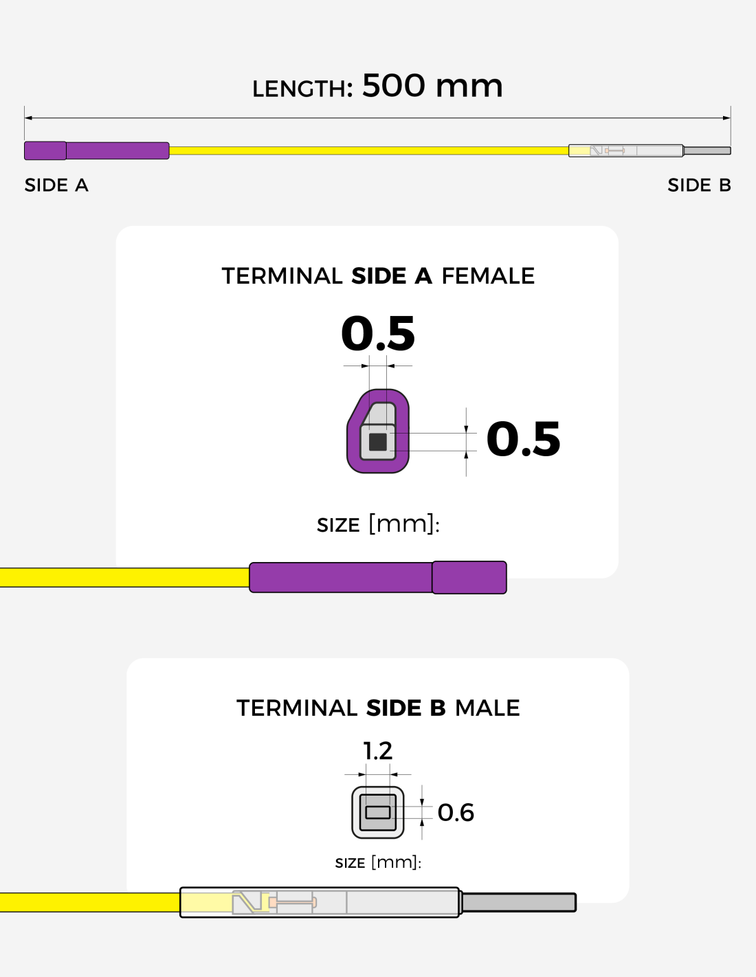500 mm interconnection cable with MQS 0.63 × 0.63 mm female terminal and MCON 1.2 × 0.6 mm male terminal.