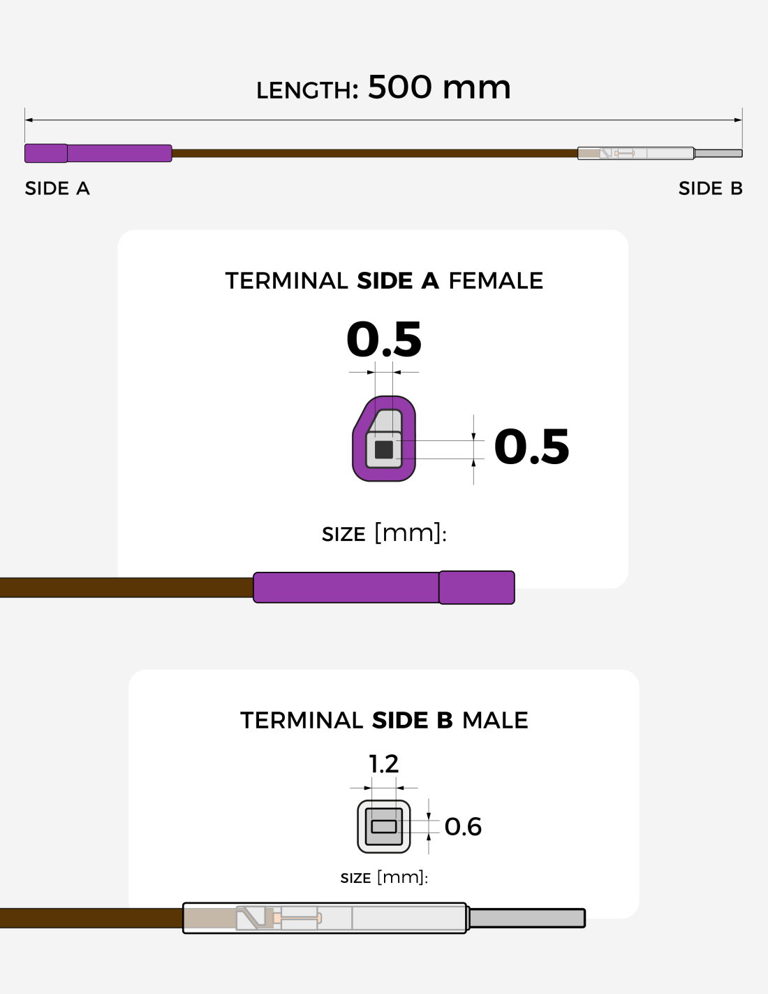 500 mm interconnection cable with MQS 0.63 × 0.63 mm female terminal and MCON 1.2 × 0.6 mm male terminal.