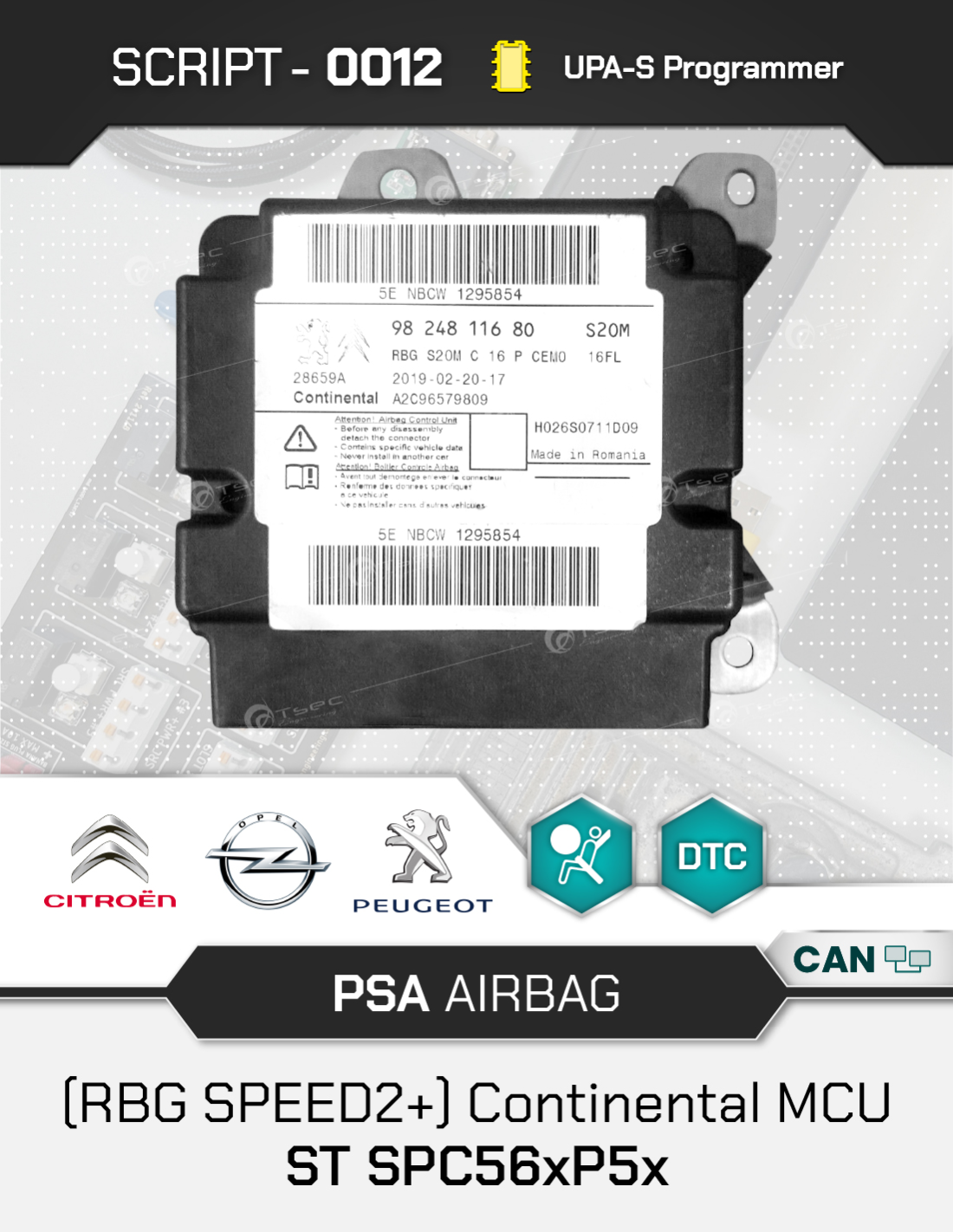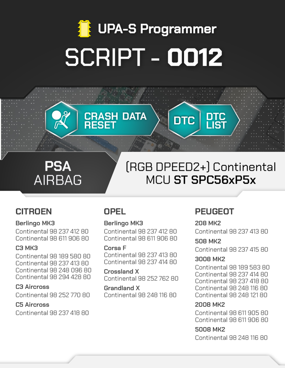 SCRIPT-0012 is a dedicated solution for resetting crash data in PSA Group Airbag control units (Peugeot, Citroën, DS, Opel) equipped with Continental electronics and ST SPC560P50 / SPC56AP54 microcontrollers. The script allows technicians to quickly restore the Airbag module after an accident or memory fault by removing stored crash data and restoring normal ECU functionality.