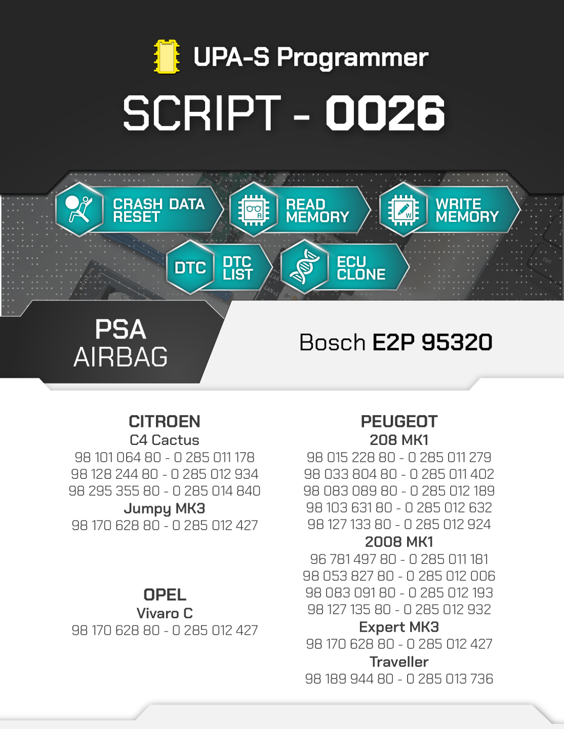 Lo SCRIPT-0023 è uno strumento professionale sviluppato per il reset dei dati crash delle centraline Airbag FCA / Stellantis Mopar Continental MCU TriCore TC233LP-32F. Il processo è completamente automatizzato, garantendo precisione e rapidità nell'intervento.
