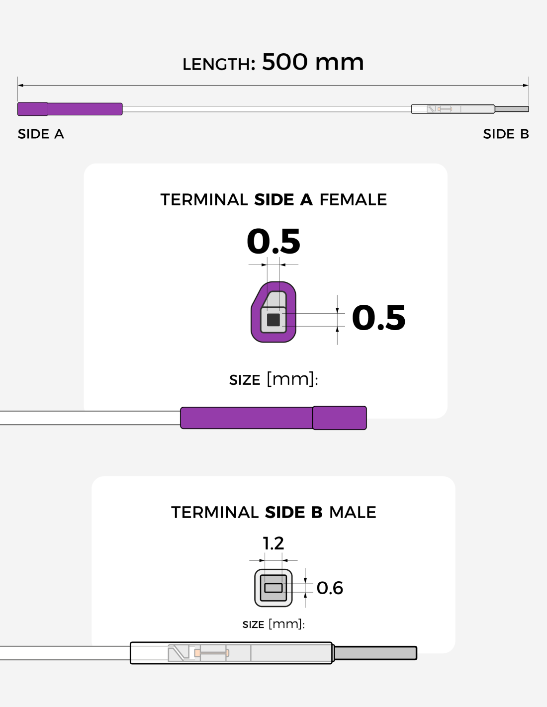 Cavo di collegamento da 500 mm con terminale femmina Nano MQS 0.5 x 0.5 mm (guaina bianca) lato A e maschio MCON 1.2 x 0.6 mm lato B.