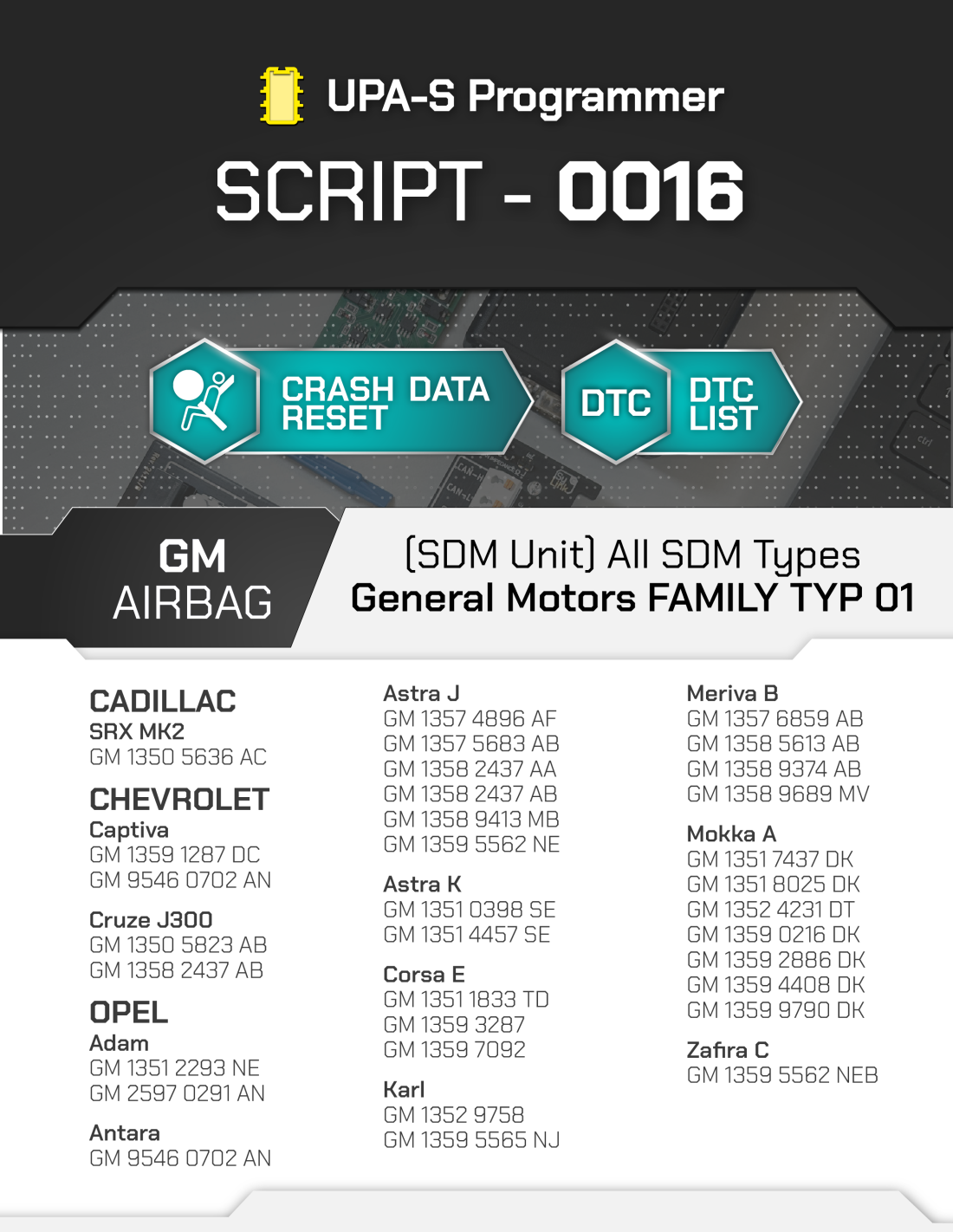 Lo SCRIPT-0016 è uno strumento professionale sviluppato per il reset dei dati crash delle centraline Airbag GM Airbag (SDM) All SDM Types - GM FAMILY TYP 01. Il processo è completamente automatizzato, garantendo precisione e rapidità nell'intervento.