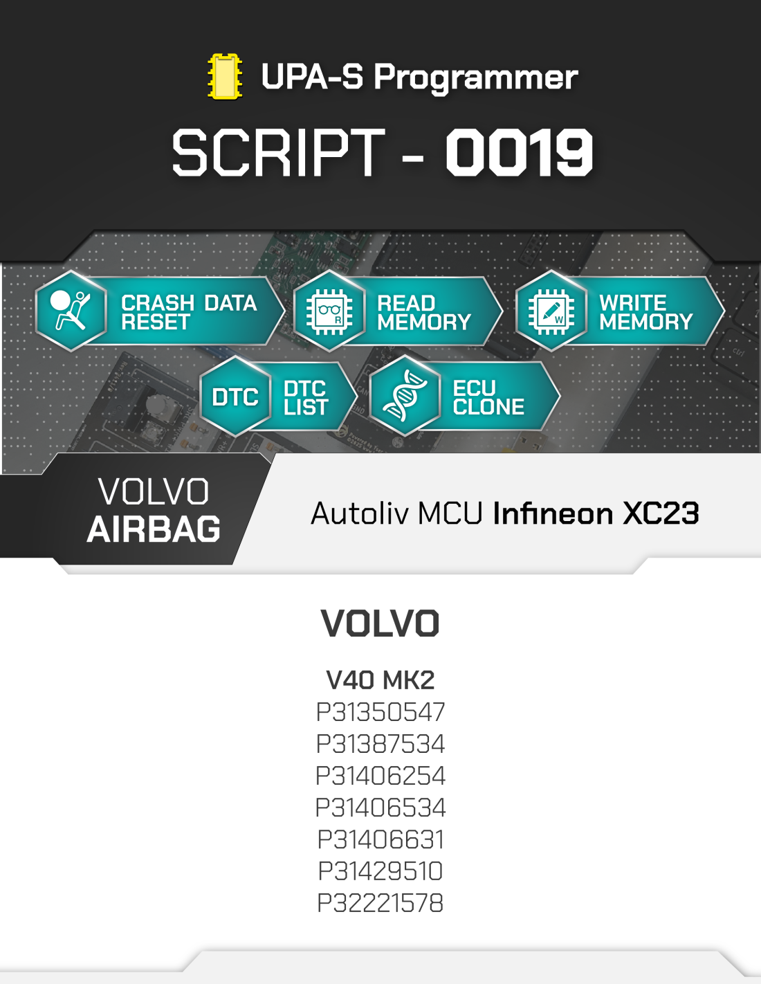Lo SCRIPT-0019 è uno strumento professionale sviluppato per il reset dei dati crash delle centraline Airbag Volvo Autoliv MCU Infineon XC23. Il processo è completamente automatizzato, garantendo precisione e rapidità nell'intervento.