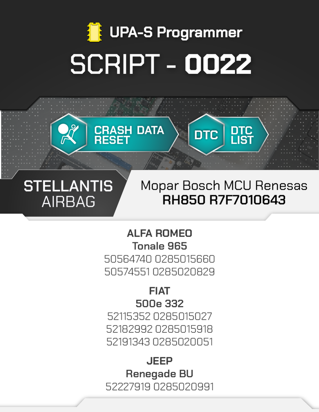 Lo SCRIPT-0022 è uno strumento professionale sviluppato per il reset dei dati crash delle centraline Airbag FCA / Stellantis Mopar Bosch MCU Renesas RH850 R7F7010643. Il processo è completamente automatizzato, garantendo precisione e rapidità nell'intervento.