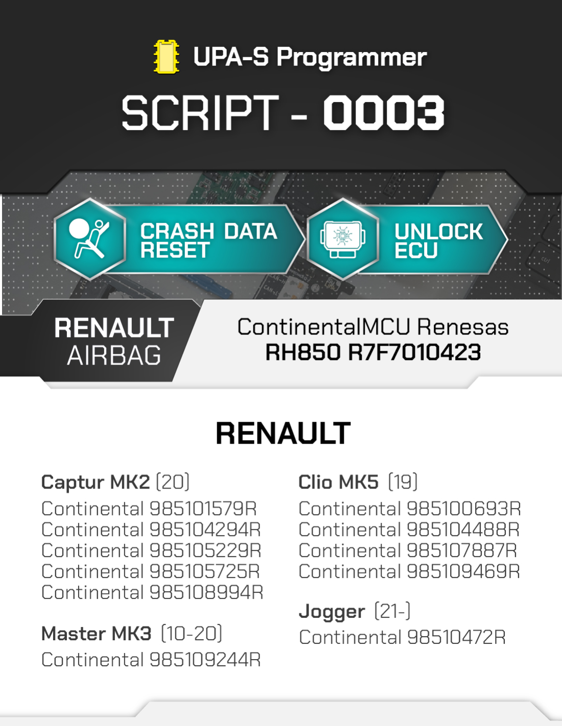 Lo SCRIPT-0003 è uno strumento professionale sviluppato per il reset dei dati crash delle centraline Airbag Renault dotate di microcontrollore Renesas RH850 R7F7010423. Il processo è completamente automatizzato, garantendo precisione e rapidità nell'intervento.