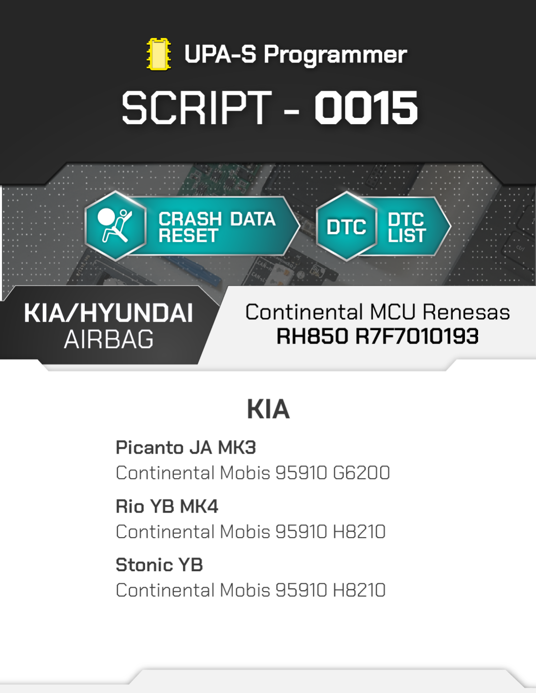 Lo SCRIPT-0015 è uno strumento professionale sviluppato per il reset dei dati crash delle centraline Airbag Kia/Hyundai dotate di microcontrollore Continetnal Mobis MCU Renesas RH850 R7F7010193 W/E2P 95xx. Il processo è completamente automatizzato, garantendo precisione e rapidità nell'intervento.