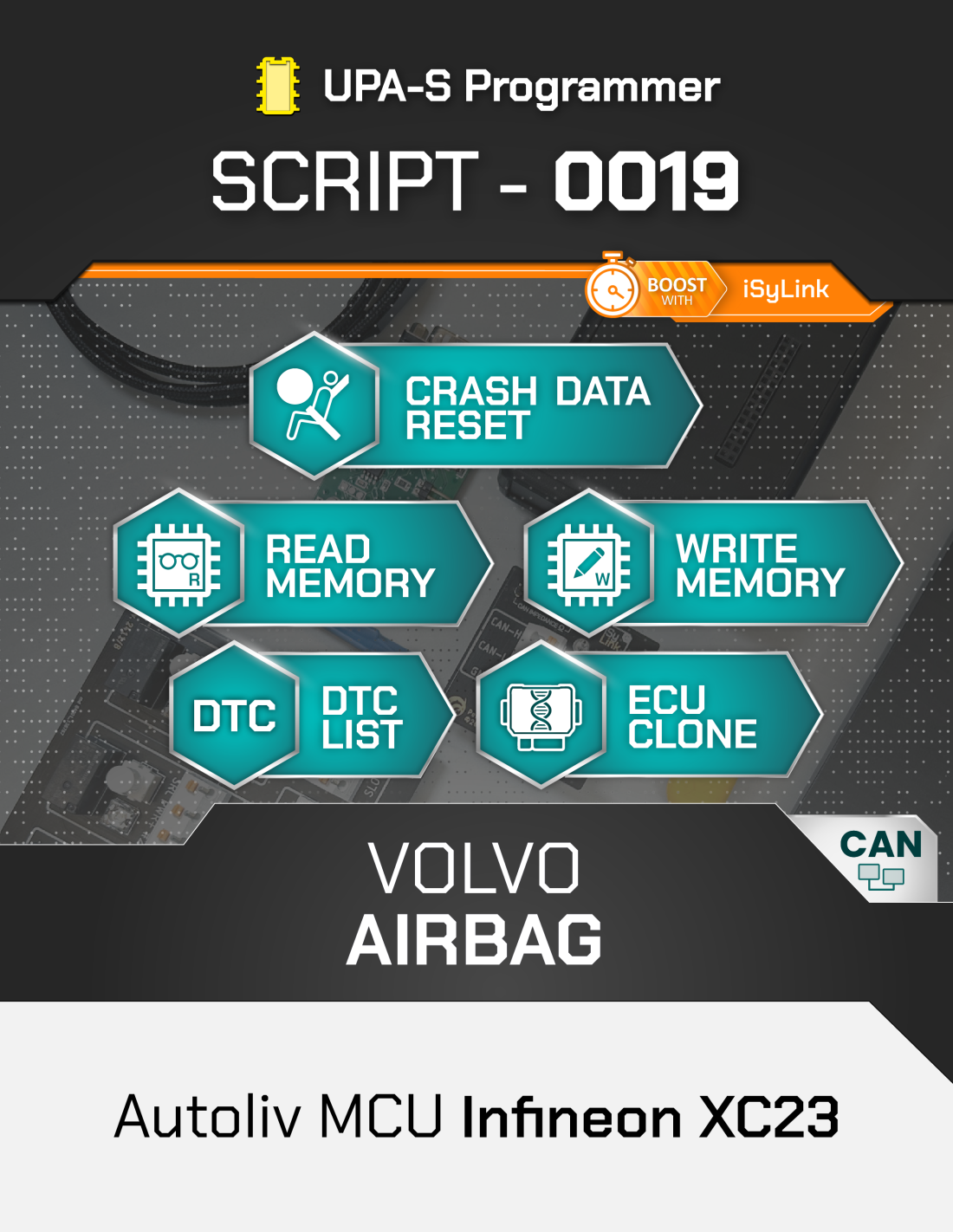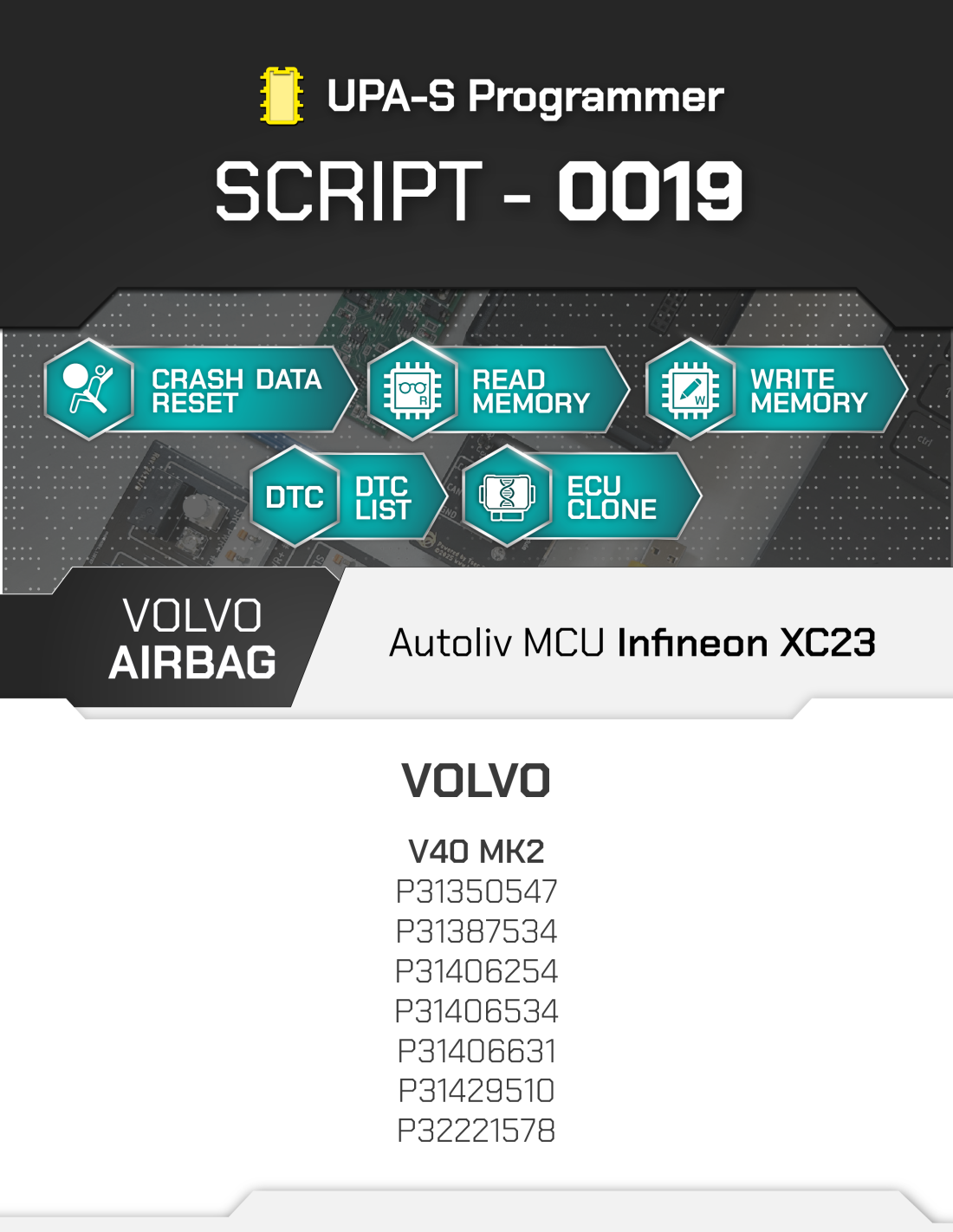 Lo SCRIPT-0019 è uno strumento professionale sviluppato per il reset dei dati crash delle centraline Airbag Volvo Autoliv MCU Infineon XC23. Il processo è completamente automatizzato, garantendo precisione e rapidità nell'intervento.
