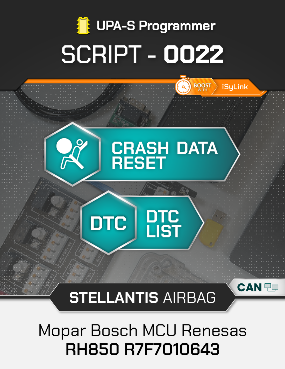 Lo SCRIPT-0022 è uno strumento professionale sviluppato per il reset dei dati crash delle centraline Airbag FCA / Stellantis Mopar Bosch MCU Renesas RH850 R7F7010643. Il processo è completamente automatizzato, garantendo precisione e rapidità nell'intervento.